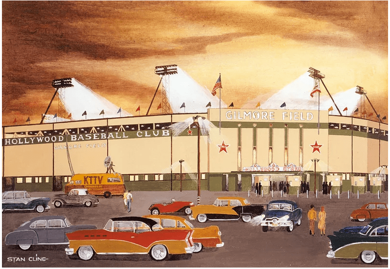 == More about Stan Cline, the artist who did the cover, from Taylor: “Stan grew up a couple of blocks from Gilmore Field. Artie Harris was a classmate at Fairfax and made the introduction. He shared that he made a specific point to include the KTTV truck in his work because as a kid he used to volunteer to drag cable – once inside the ballpark he would hide to avoid having to pay for a ticket!” Here is Cline’s nostalgia gallery website where his full rendition of Gilmore Field (as well as L.A.’s Wrigley Field and many others) exists for sale at various sizes.
