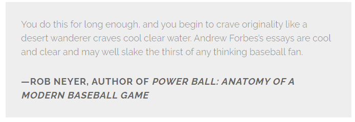All the essays Forbes pens leads to that karmic moment of clarity. Up to that point, his 26 previous works take more meaningful moments from baseball and try to find how the game’s heartbeat coordinates with lessons learned.