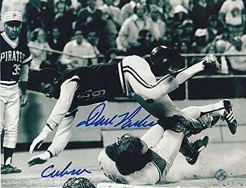 In 2017, a very cool website, The Hall of Very Good, made Parker one of its inductees under the headline that he has “always been a badass.” A man with a 6-foot-6, 230-pound-plus frame in one of those Pirates’ black and gold uniforms, and the pillbox hat, he was making a fashion statement without knowing it. He wore football faceguard bar on his helmet, then went to a hockey goalie mask during the 1978 season after a collision at home plate with the Mets’ John Stearns (above), something that resonated 30 years later with Paul Lukas at UniWatch/ESPN, calling Parker the first to wear a baseball/football hybrid contraption.