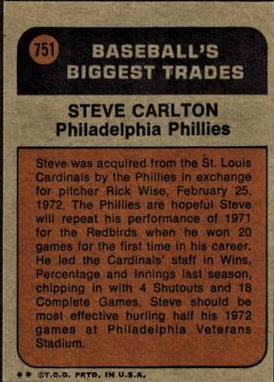 After his first seven seasons in St. Louis, Lefty was traded to Philadelphia for Rick Wise in 1972. That season, the 27-year-old Carlton won 27 games with a 1.97 ERA and 310 strikeouts in 41 starts and 346 innings pitched – each category leading the National League, as well as a 12.1 WAR. It got him a unanimous Cy Young Award vote and fifth place in the MVP balloting.