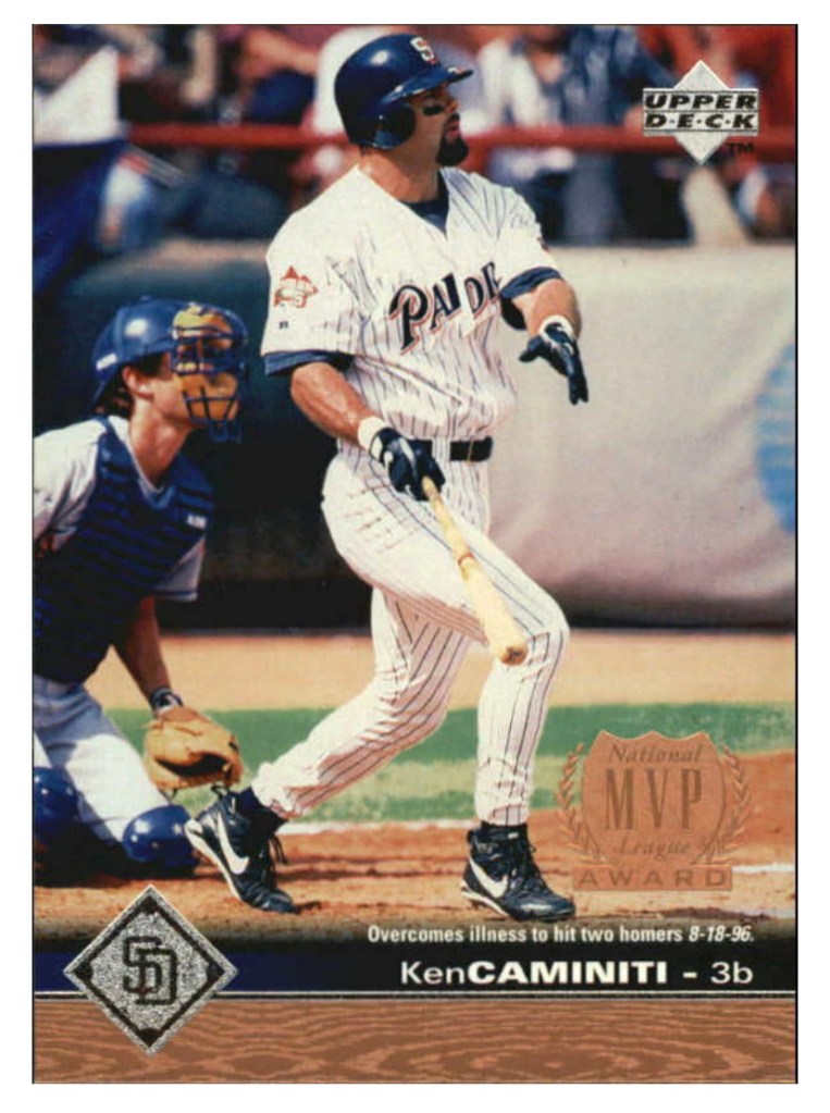 == In 2016, San Diego’s Jane Mitchell discusses why she was drawn to have Caminiti as a guest on her “One-On-One” show during the ’96 season: “In the spring and summer of 1996, I was so caught up in a television project surrounding the Republican National Convention, I didn’t realize the Ken Caminiti sensation buzzing around the city. I hadn’t witnessed his stellar feats at third base or his powerful at-bats. Hadn’t heard about the “Snickers” incident in Mexico, nor seen his stoic presence contrasted with his sparkling eyes and smile in the dugout or off the field. These were all part of the Cammy mystique that had captivated a community of baseball fans. But when it looked as if I would be involved in the new COX/Padres television venture Channel 4 Padres, I sat on my mother’s couch and watched the Padres beat the LA Dodgers to clinch the National League West Division. Ken Caminiti became front of mind.”