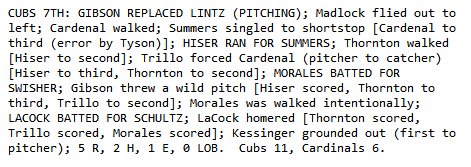 Bob Gibson, age 39, just three seasons removed from a 19-win year, walks in from the bullpen in the seventh inning. He leave everything a mess.