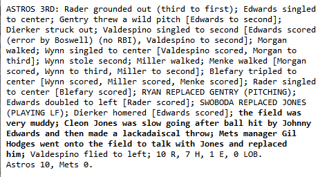 The Astros came into New York and treated the Mets as miserable as the weather was getting. On that day, Houston won the first game of a doubleheader, 16-3, and was already up 8-0 in the third inning of the second game when the Johnny Edwards went opposite field and plopped a hit down the left field line.