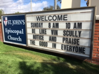 In addition to reminding worshipers about the times for the Sunday services, the clip-on letters spelled out a reminder: “Be Like Vin Scully … Notice And Praise The Good In Everyone.”