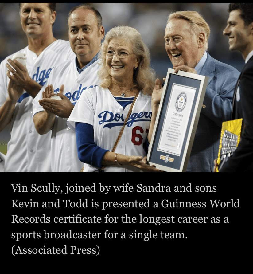 There exists a “Vin Scully Map Guide to L.A.” for heaven’s sake – a physically rosary of places one can go to feel part of Scully’s journey from the Coliseum and Dodger Stadium, to his residence in Westwood (neighbors with John Wooden), Pacific Palisades, Sherwood Country Club and now in Hidden Hills, his star on the Walk of Fame, even the Costco in Westlake Village where he lost his 1988 World Series ring.