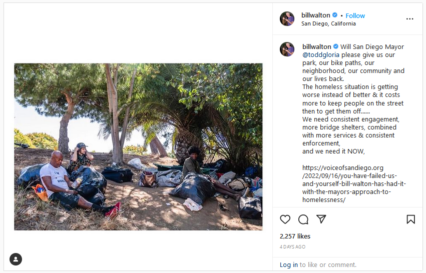 An Instagram post shows a collection of those who appear homeless with the text: “@toddgloria please give us our park, our bike paths, our neighborhood, our community and our lives back …”