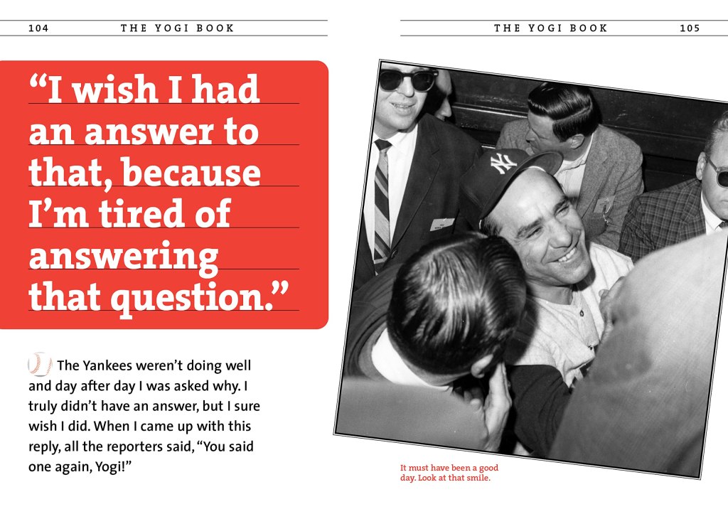In 2008, “You Can Observe A Lot by Watching: What I’ve Learned About Teamwork from the Yankees and Life.” In 2002, “What Time Is It? You Mean Now? Advice for Life from the Zennest Master of Them All.” In 2001, “When You Come to a Fork in the Road, Take It! Inspiration and Wisdom From One of Baseball’s Greatest Heroes.” In 1999, “The Yogi Book: I Really Didn’t Say Everything I Said.” and in 1989, “Yogi: It Ain’t Over,” which seems to hit on a familiar theme again.