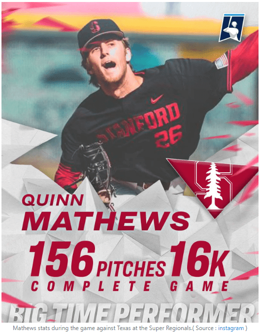 During the regular season, the 6-foot-5 lefthander threw at least 100 pitches in 15 of his 16 starts. As the Cardinal faced an elimination game against Texas in the CWS super regional, Mathews was allowed to throw 156 pitches in an 8-3, complete-game victory, which included 16 strikeouts.