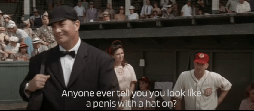 For our money, the line Hanks delivers right after that “no crying” rant, after the umpire scolds him, was far more quote worthy: “Did I ever tell you, you look like a penis with a little hat on?”
