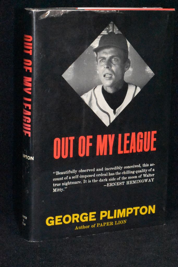 Book 1: George Plimpton’s “Out of My League” (1961, Harper and Brothers Publishing, 150 pages, purchased for $19.95) recounts the day in 1958 when he talked his way onto the mound at Yankee Stadium to see what it would be like if an Average Joe (he was a 31-year-old known-enough-around-New York scribe) actually pitched against real All Stars. It’s fascinating how rudimentary this all came to happen – and it’s a keen reminder about how the participatory sports journalism we came to know him for was really inspired by Paul Gallico’s work decades earlier. We had thought this was only done for a Sports Illustrated story – it involved hiring an SI photographer to document it, and the magazine put up $1,000 as a “contest” prior to an exhibition game for Plimpton to get the attention of Willie Mays, Mickey Mantle, Frank Robinson, Gil Hodges and other legends of the day to buy into it. It doesn’t end well, as an exercise for Plimpton’s ego, but he so creatively tells how it devolved in front of his blurry eyes and what he took away from it. Even more impressive is the book has a blurb endorsement from Ernest Hemingway, and it launched Plimpton’s mission to become a Detroit Lions quarterback and Boston Bruins goalie.