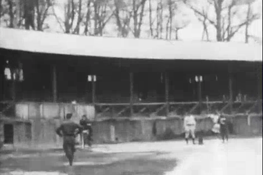 = The Library Of Congress has in its archives a short 27-second film clip called “The Ball Game,” with the creator credit assigned to “Thomas A. Edison, Inc., 1898.” The description: “Photographed from one camera position behind home plate, the film shows a baseball game in progress. The Reading pitcher has just let a Newark (New Jersey) batter walk to first. He gets up on his toes, ready to head for second base. The next batter up cracks first ball pitched for a two bagger, and races for the base with a burst of speed. The first baseman just misses a put-out. A man on the coaching line yells, the umpire runs up to make a decision, and a small boy runs behind the catcher, close to the stands, where there is a great commotion.”