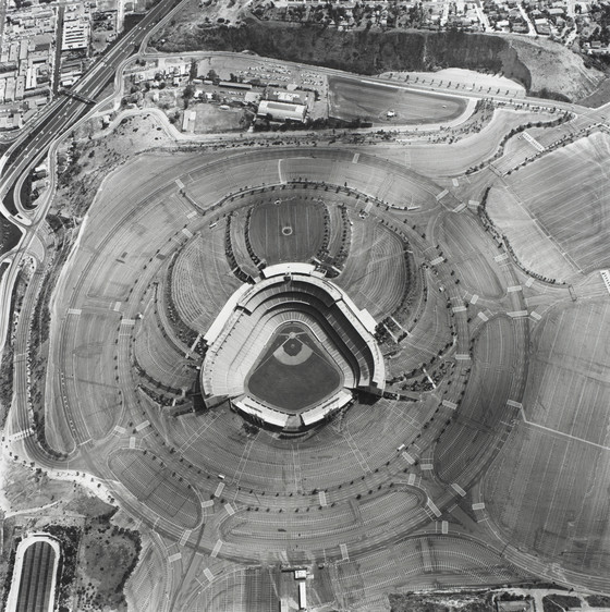 The Los Angeles County Museum of Art has an exhibit called “Ed Ruscha / Now Then” starting April 7 and running through October 6. It also has an online digital display of 30 of Ruscha’s “Parking Lots” — here is the Dodger Stadium shot as it was printed on gelatin silver paper for display.
