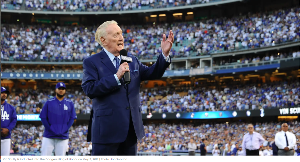 He’s been on the field recording Dodgers’ history since he and I left USC in the mid 1980s. The moments Soohoo has alone with Scully — including Scully taking him with him to receive the the Presidential Medal of Freedom in 2016, and the stories that must be with it — are worthy of a published collection, should the Dodgers grant that accessibility to his work. There’s also this shot from Scully’s Ring of Honor induction in May, 2017.