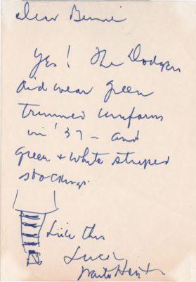 In this handwritten letter he answers a fan’s question about the Dodger uniforms.