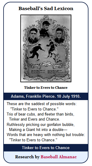 Rapoport’s answer to this via email: Remember now that “Tinker to Evers to Chance” was a lament, written by a fan of the Giants in New York. The closest Ring ever came to something similar was his classic lead in “The Tears of Christy Mathewson” on Page 155. I don’t think I ever saw Ring make a reference to Tinker or Evers although he adored Chance, the player.