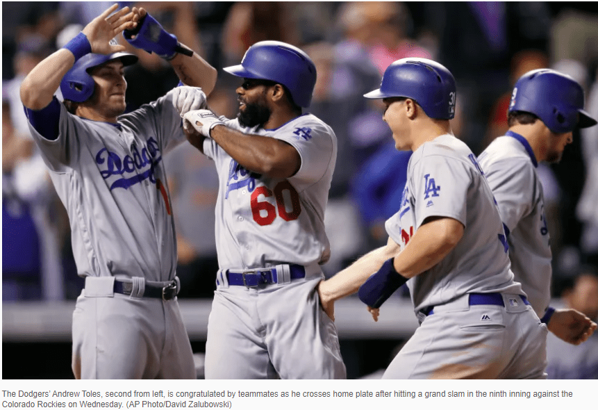 Andrew Toles, the Dodgers’ rookie outfielder, has shown dramatic versatility over his first 33 days on a major-league roster. … a gifted athlete … good baseball IQ, too. … His deadpan sense of humor, hidden behind a perpetually wide-eyed expression and a luxuriant beard, would endear him to any teammate even if he couldn’t hit worth a lick. It just so happens that Toles can hit worth a lick. With the Dodgers down to their final out Wednesday, Toles hit a grand slam to complete a stunning 10-8 comeback victory over the Colorado Rockies.