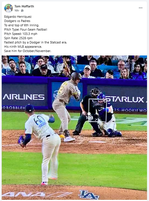 Edgardo Henriquez, Los Angeles Dodgers pitcher (2024 to present): On Aug. 16, 2025 this moment above happened for the 23-year-old, 6-foot-4, 200-pound pitcher.