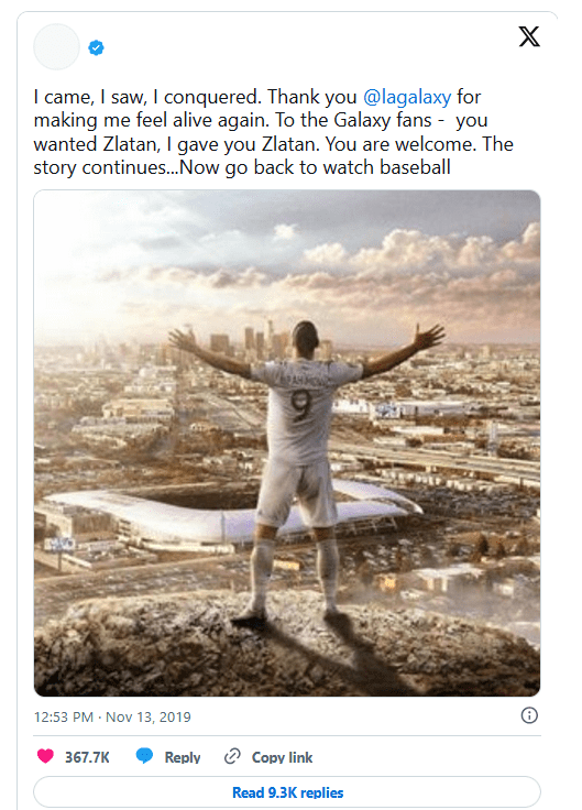 After 19 seasons in some of the world’s most recognizable leagues and teams, and following two years with Manchester United of the Premier League, the 36-year-old man bun found a way to make himself relevant again.The Los Angeles Times announced his signing under the all-caps headline: “He’s Hard to Ignore.” In that same newspaper section, Ibrahimovic took out a full page ad that had the words: “Dear Los Angeles, You’re Welcome,” with his signature above the No. 9. Asked if L.A. was big enough to handle his personality, the Swede responded: “If it’s not, I’ll make it bigger … After being in Europe, winning 33 trophies, playing in the best teams in the world, playing with the best players in the world, I wanted to come to the US and play my game there. I wanted people to enjoy my game there and to win. And I chose the Galaxy to do that.”