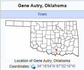 Also note that in 1991 when he was added to the Oklahoma Hall of Fame, the state had renamed a city for him. In 1941, Berwyn, a four-square-mile parcel along the Santa Fe railroad mainline, changed its name to Gene Autry to celebrate the fact he owned a 1,500 acre ranch. (As the story goes, his California home burned down eight days before the city name was changed, so it was thought he might move to the ranch full time. But just three weeks after the ceremony, Pearl Harbor happened, Autry joined the military, he sold the ranch after the war, and it’s now all but disappeared). The 2020 census reports a population for Gene Autry of 154.