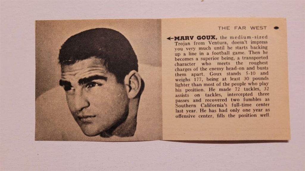 As Sports Illustrated’s John Underwood once wrote about him in 1967: Marvin Goux has vicious black eves and over each one a heavy strip of macadam that looks like an eyebrow. He wears his hair cut short, in the style popular at state prisons, and he keeps his belly taut and flat for the Hollywood bit parts he plays by wearing rubber corsets that make him sweat when he is on the field at the University of Southern California, where he works as an assistant coach for John McKay. Marv’s manly figure has been seen on the screen whipping Tony Curtis into submission with a felt bullwhip, and on other less attractive adventures. Marv has a good scowl, a commendable frown. He comes across like trouble ahead. He is known as a fellow who rises to the occasion.