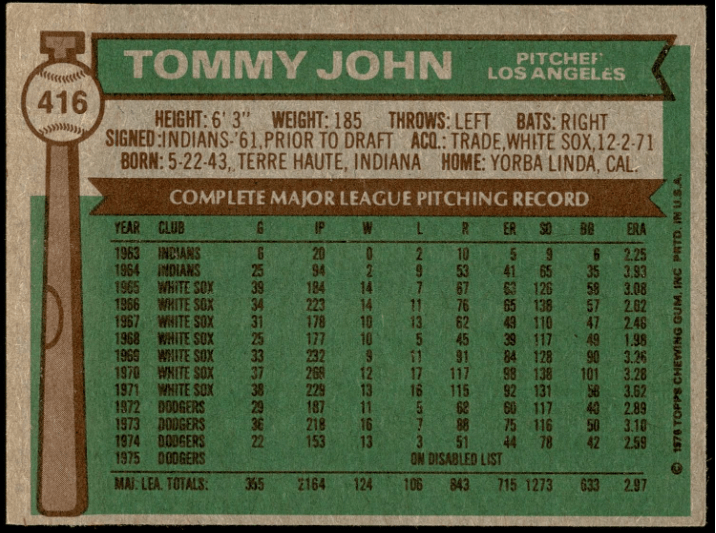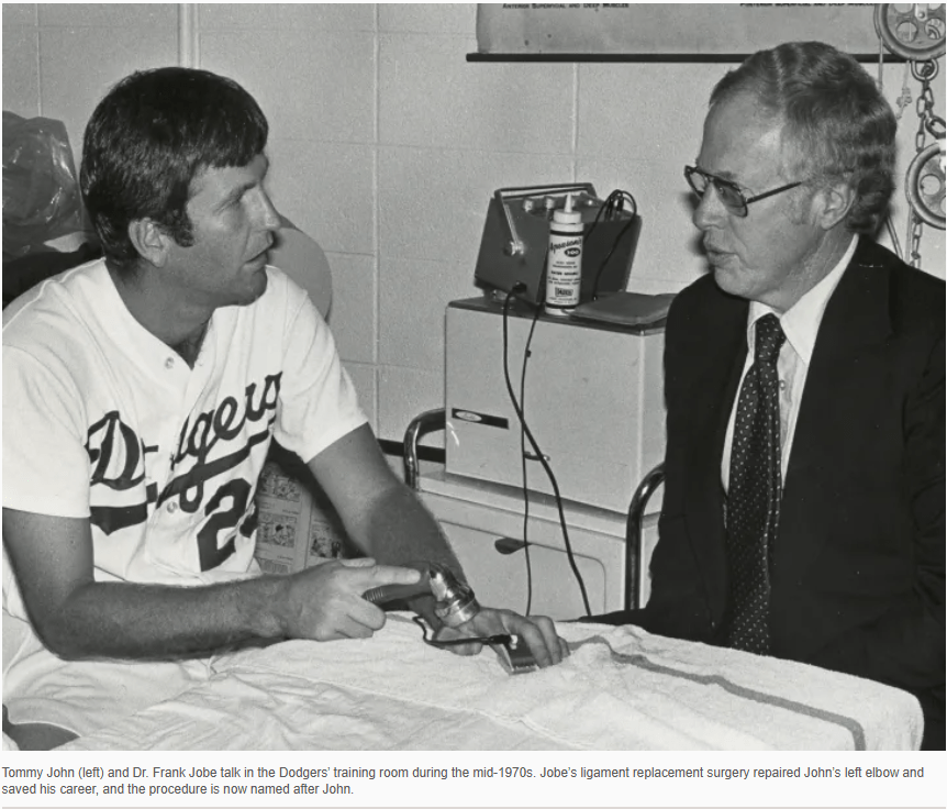 Koufax’s career ended at 30 due to an elbow injury. Jobe believed later he could have tried this UCL surgery. Consider: Koufax pitched 12 years and won 165 games. John pitched 14 years and won 164 games following his return in 1976.
