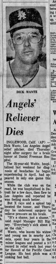 In an obituary for Wantz that appeared in the San Bernardino County Sun, Angels pitching coach Marv Grissom said after seeing what he did in spring training: “He can be a great pitcher.” Grissom was a pallbearer at his funeral as was Angels farm system director Roland Hemond.