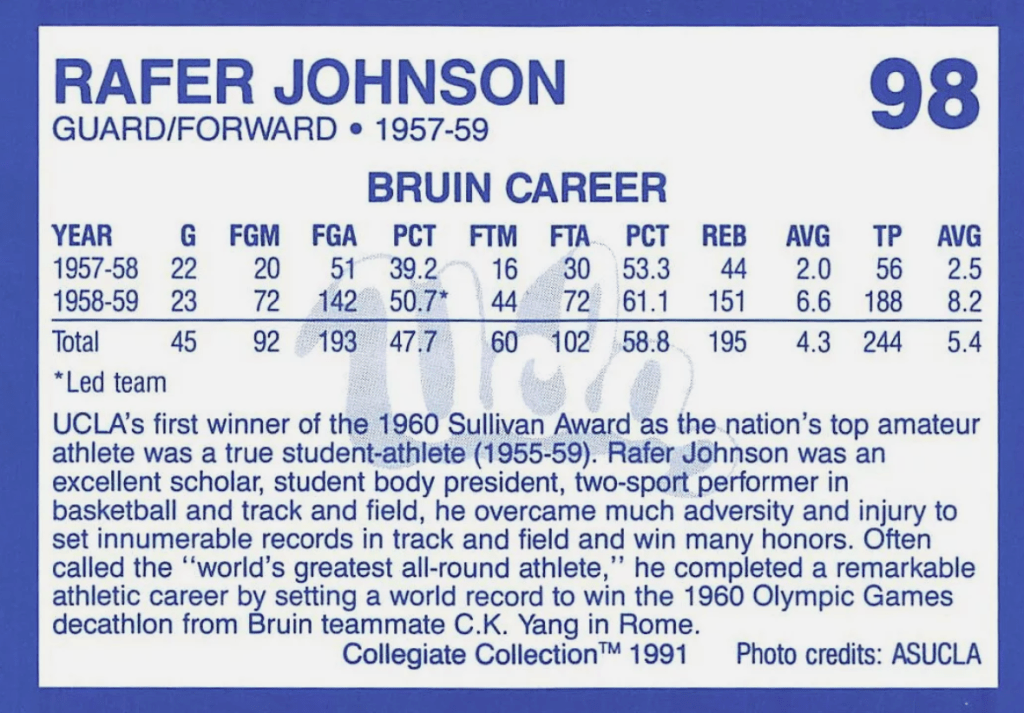 The Rome 1960 Olympic gold medalist in the decathlon, having also won silver in Melbourne in 1956, Johnson spent his athletic career in between the Olympiads playing basketball for Bruins coach John Wooden, a starting 6-foot-3 swingman on the ’58-’59 team that went 16-9.