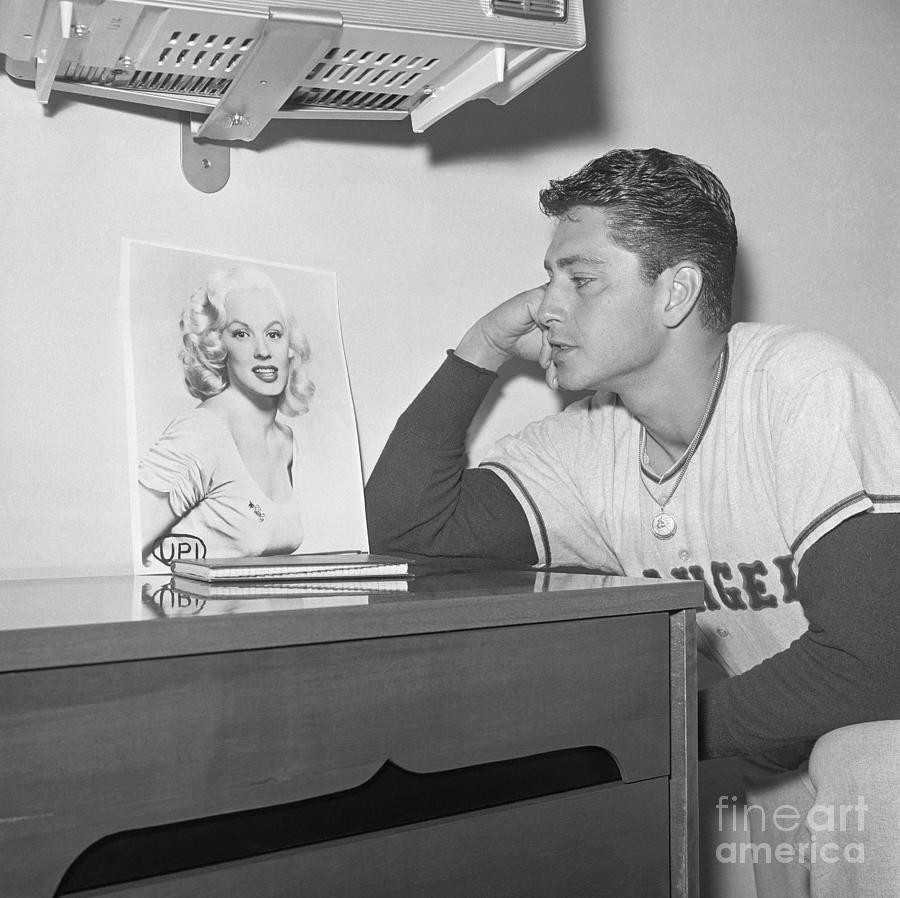 Bo Bellinsky takes a wistful look at a photo of his intended, actress Mamie Van Doren, at his hotel room during spring training. The couple confirmed they are engaged. Van Doren, 30, married twice before, and Bellinsky, 26, have been dating frequently. As it turned out the engagement didn’t lead to a wedding. (Photo: Getty Images).