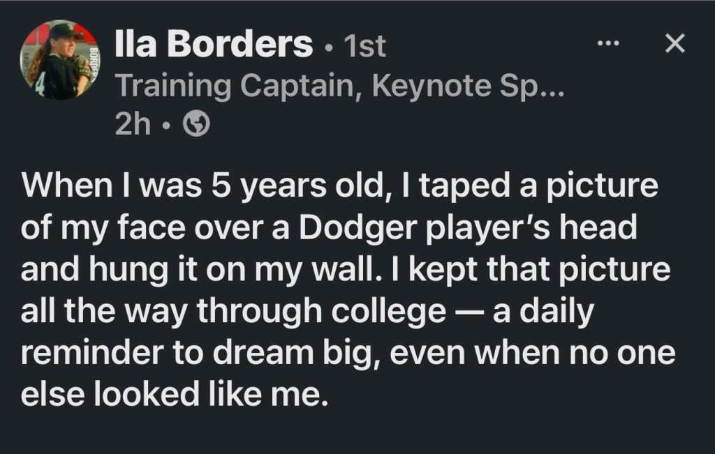 During those interviews, she retold stories about how as an 8 year old in 1983 she was inspired to play baseball after seeing the Dodgers’ Dusty Baker hit a home run at Dodger Stadium.