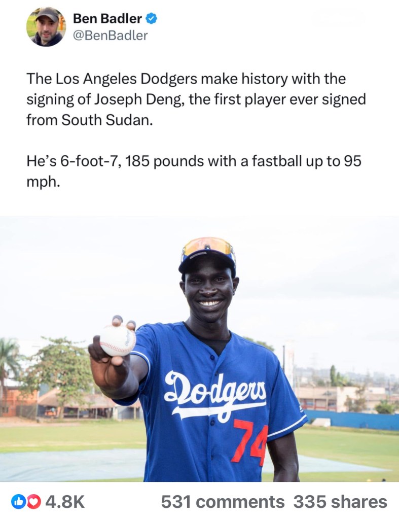 Joseph Deng, Los Angeles Dodgers pitcher (2025): Maybe a bit premature, but a notable signing by the team — Deng, a 6-foot-7, 185-pound, 17-year-old righthander, is the first player from South Sudan to sign a professional baseball contract.