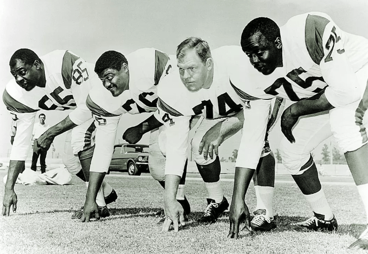 Prior to the ’63 season, Rams GM Elroy Hirsch made a trade with the New York Giants, swapping out its younger right defensive end John LoVetere and a draft pick for their Pro Bowl RDT Rosey Grier (6-foot-5, 284 pounds), a seven-year veteran and already 31 years old. Grier had been part of a Giants line with Andy Robustelli, Jim Katcavage and Dick Modzelewski that a 1957 New York Daily News’ headline referred to as “A Fearsome Foursome.”