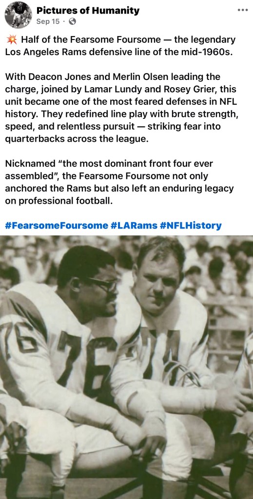 In a 2025 Los Angeles Times feature on the Los Angeles Rams’ defensive line of Byron Young, Kobie Turner, Braden Fiske and Jared Verse, there was a lot of “Fearsome Foursome” channeling, including recreating a photo of the four lined up in a three-point stance. Verse, 25, even talked about meeting Grier, 93, the only living member of the original Foursome from the ’60s, during a photo shoot.