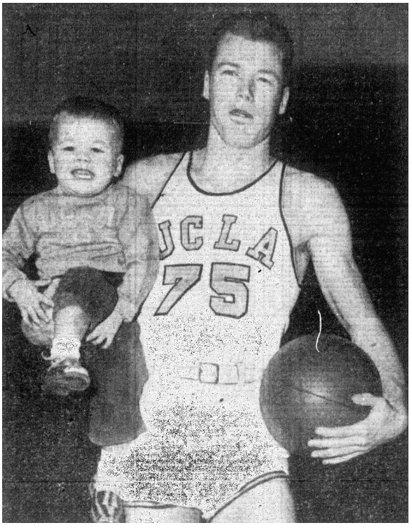 It seems odd that a 5-foot-9, barely 120-pound guard out of L.A.’s Washington High and captain of John Wooden’s Bruins team at a senior in ’51 would sport such a large number like 75. The rules in place usually called for players to wear nothing larger than 55 so referees could signal fouls to the scorekeeper with their hands. Sheldrake, named to the United Press’ “Little All-American” team of players 5-foot-10 and under, was a Navy aviation mechanic before he went to UCLA and set a school record with 38 points against Stanford as a senior, the year he actually started at forward. Nine members of the UCLA team moved on, so Sheldrake went back to guard, the position he had during his first two seasons of varsity play as he was captain of the Bruins’ freshman team in ’47, setting a record with 262 points. As a sophomore, Sheldrake started the last two games of the season against USC and led his team with 17 points in the first encounter. As a senior, Sheldrake won the Coach Caddy Works Award for competitive spirit and contribution to the team. During Sheldrake’s time on Wooden’s first three varsity teams, the squad went 65-24 and won three Southern Division championships, including UCLA’s first full conference title and NCAA appearance in 1950.
