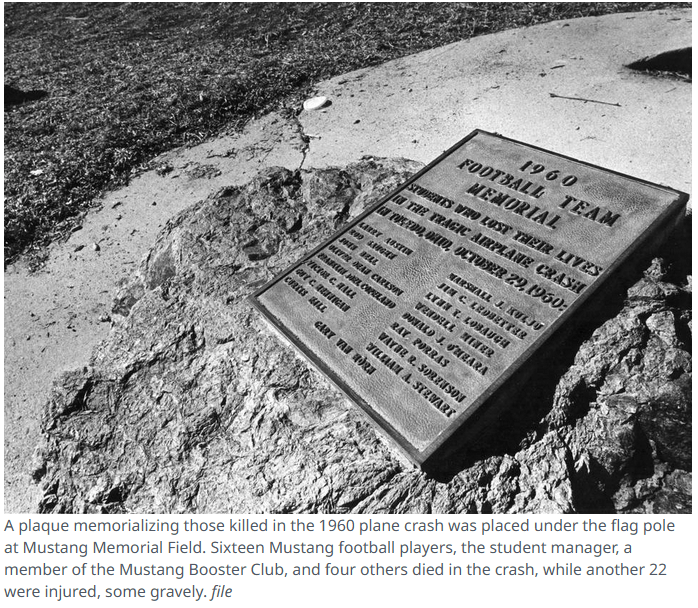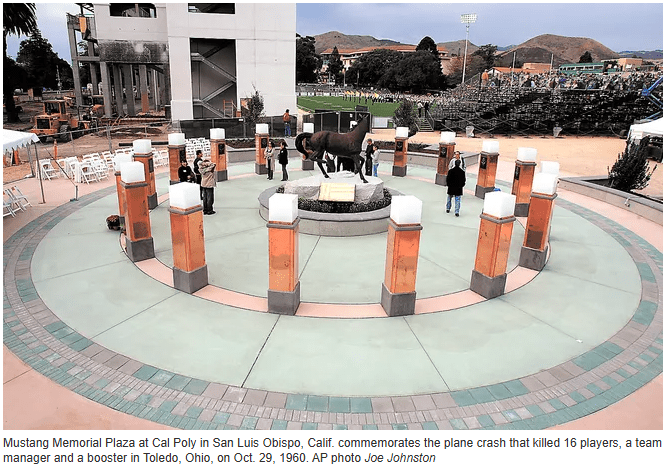 The entire 1960 football team was inducted in the school’s Hall in 2006, on the event’s 46th anniversary. The next day, at a Cal Poly home game against Southern Utah, the football field was dedicated as Mustang Memorial Field, with former players and members of the crash victims’ families at midfield.