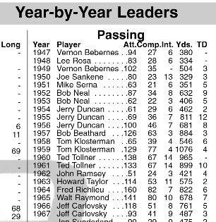 From 1952 to 1959, Cal Poly’s football team combined to post a 59-18 record, including 9-0 in ’53. Tom Klosterman, the older brother of Loyola quarterback great Don Klosterman, and future San Diego Chargers GM Bobby Beathard, out of El Segundo High and El Camino College, were the dual quarterbacks for the Mustangs before Ted Tollner arrive.