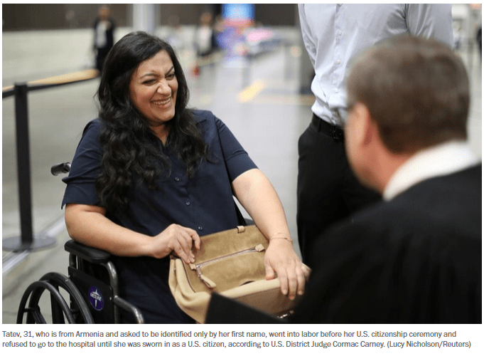 Carney saw what was happening and devised a creative solution: He found Tatev in the corner of the Convention Center and “preformed an impromptu naturalization ceremony just for her … (she) raised her right hand, swore an oath, and became official.