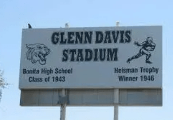 Bonita High named its football field after Glenn Davis in 1987 – but it was not the stadium where he played. The Bonita High in Davis’ day was at the current site of Damien High, as the current Bonita campus was built years after he graduated.