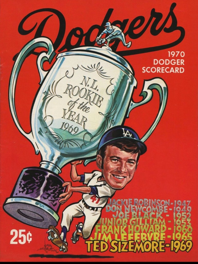He started the ’69 season as the Opening Day shortstop, but was moved to second base within a few weeks when the Dodgers brought back Maury Wills. Posting a .359 batting average by the end of April, Sizemore ended up with 160 hits in 159 games and a .271 average to win the NL Rookie of the Year Award voting. He hit .306 his next year in 96 games, but the Dodgers, who originally drafted him as a catcher, decided to package him in a deal with St. Louis to get Dick Allen in 1970. They traded back with St. Louis to get Sizemore for Willie Crawford in 1976 as the rumor was the Dodgers were about to deal shortstop Bill Russell to the Cardinals for Reggie Smith, but that never happened. After one season back in L.A. (as he wore No. 5), Sizemore was dealt to Philadelphia.