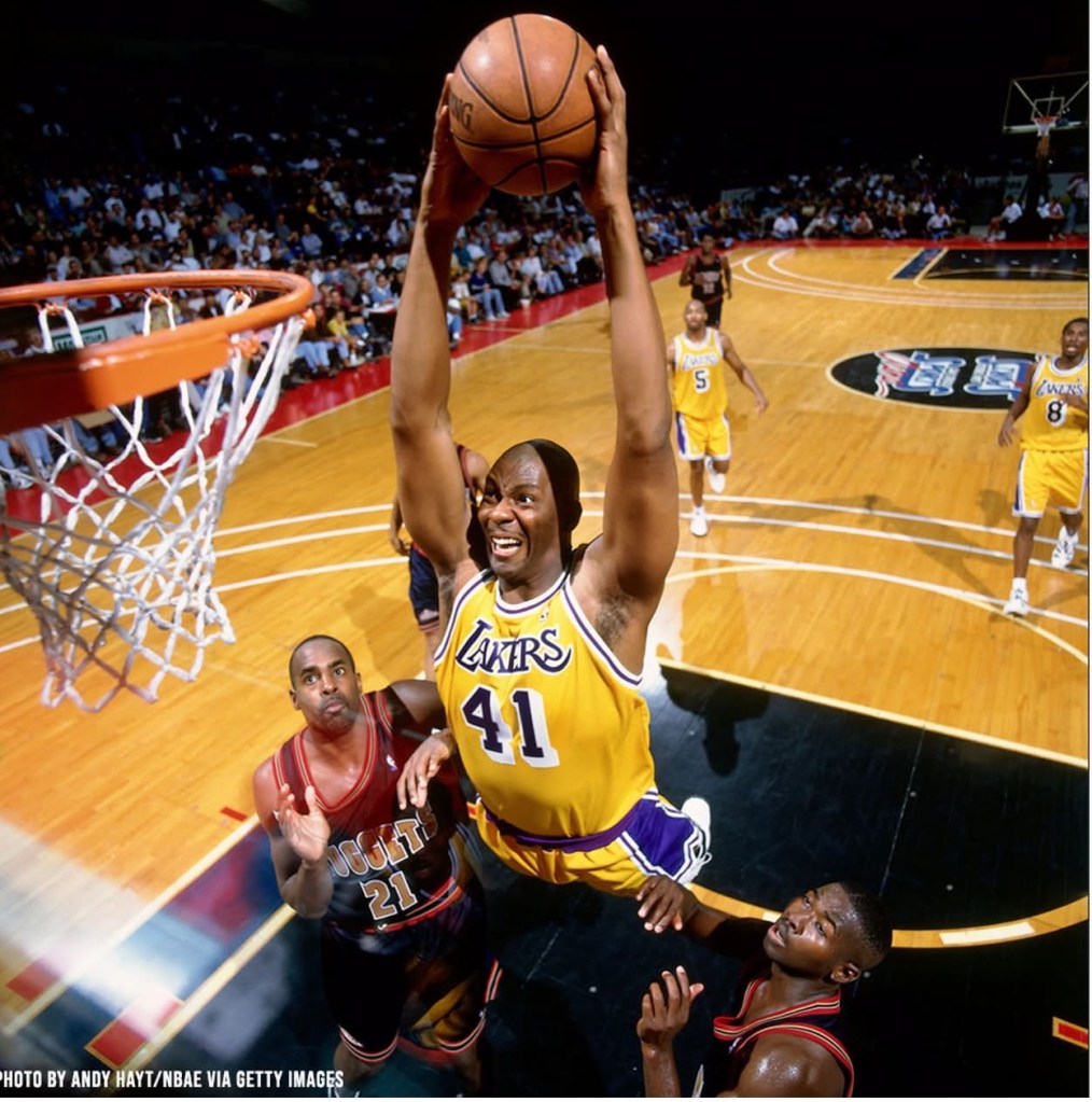 The 6-foot-11, 215-pounder from Morningside High of Inglewood went to Clemson University and came back to So Cal, scoring more points in the 1990s decade (6,408) than any other Laker. He also ranks third in franchise history in blocks. That decade started with a Lakers roster including Magic Johnson, James Worthy and Byron Scott, and ended with Kobe Bryant and Shaquille O’Neal. As a starter from ‘93 to ‘97, Campbell averaged 13.4 points and 7.1 rebounds. But during the 1998-99 season, as GM Jerry West felt there was a missing piece, Campbell was traded to Charlotte along with Eddie Jones for three-time All-Star small forward Glen Rice, who took his No. 41. Campbell died at 57 in 2025, the same year Morningside High closed.