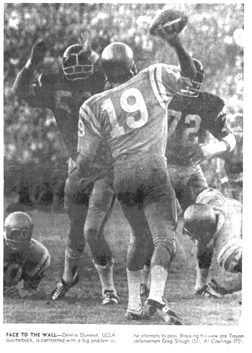 USC’s line bunched together a conference-low 95.6 yard rushing a game and only 2.3 yards a carry. It made its biggest impact in the ’69 USC-UCLA game, bouncing Bruins quarterback Dennis Dummit “across the Coliseum floor like a double dribble,” wrote Sports Illustrated’s Dan Jenkins. Dummit was sacked 12 times and intercepted five times as the Trojans won, 14-12.