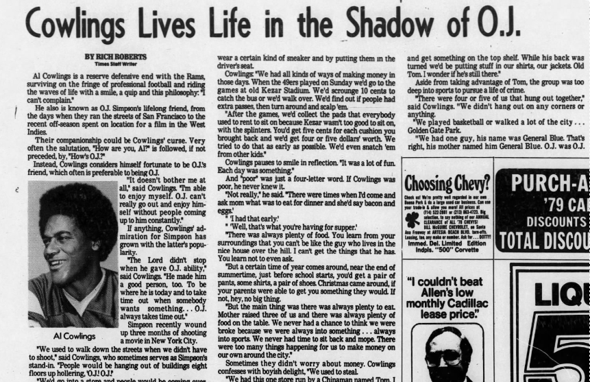 At a time when Cowlings was trying to keep his roster spot with the Rams, he did an interview with the Los Angeles Times at the team’s Cal State Fullerton training camp in the summer of ’78 that probed more about the relationship he had with Simpson. The headline on the piece could have seemed rather demeaning: “Cowlings Lives Life in the Shadow of O.J.”