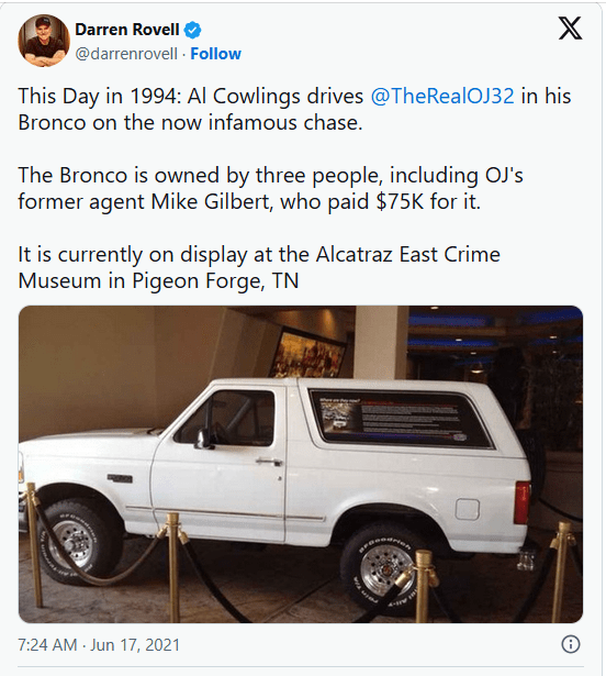 His ’93 Bronco was purchased by Simpson’s former agent, Mike Gilbert, and kept in a parking garage. In 2017 it was loaned to something called the Alcatraz East Crime Museum, displayed as part of an exhibit on the murder trial.