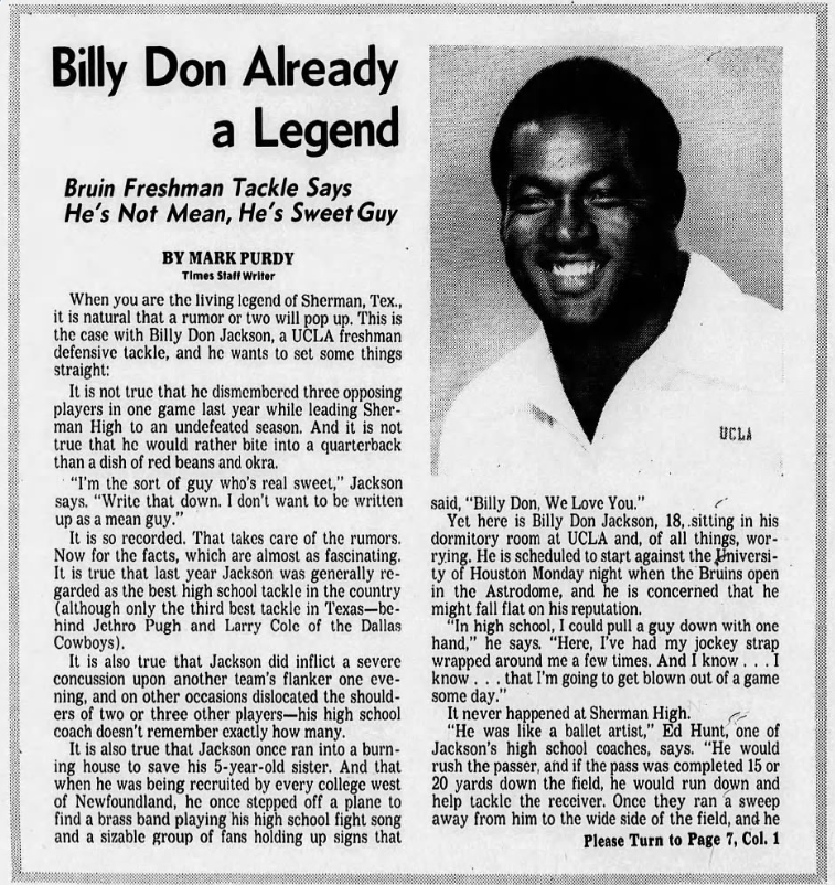 UCLA coach Matthews continued to defend Jackson and would say about him: “Billy Don worked at his studies. He had tutors and he put in the time. He just had trouble reading … I challenge anyone who says Billy Don is dumb. Play him in chess or backgammon sometime.”