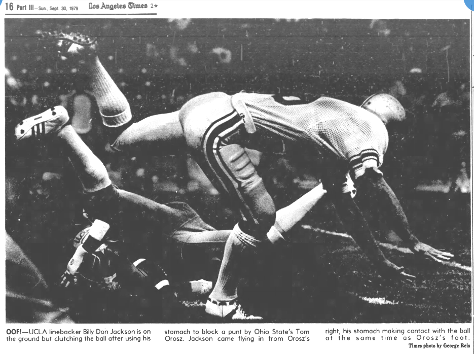 UCLA’s 2-4 start to the 1978 season included a 17-13 loss to Ohio State at the Coliseum, where Jackson’s talents were shown early on during an ABC national telecast when he blocked a punt attempt and recovered the ball in one felled swoop late in the first quarter to set up the first Bruins touchdown.