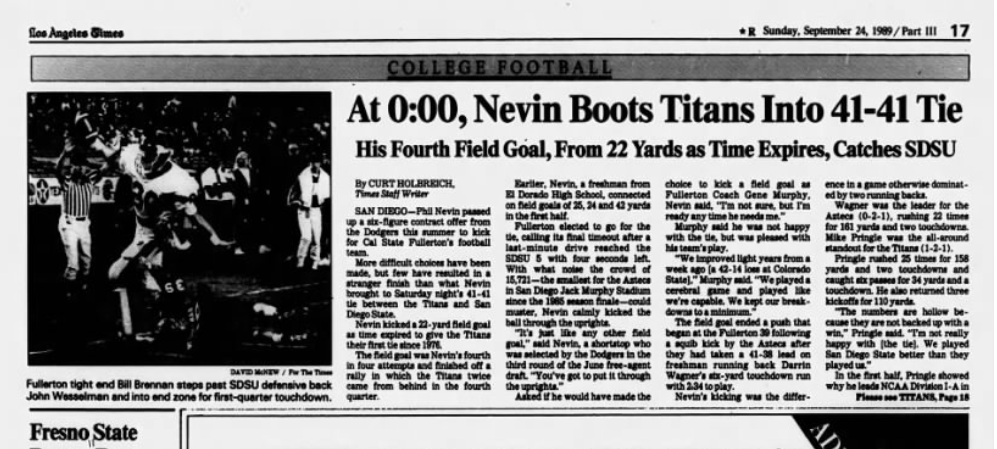 But as a place kicker and punter on the Titans’ football team for three seasons, he led led the Big West Conference in 1989 with 15 field goals out of 21 attempts, including nailing a game-tying 22-yard field goal at San Diego State to secure a 41-41 tie as time ran out at Jack Murphy Stadium, his fourth field goal of the game. He also had a 54-yard field goal earlier that season against Cal State Northridge. Nevin would make all 69 PATs in his career and 31 of 55 field goal tries. In 180 punts he averaged better than 40 yards a kick. Add to that: 3 of 4 passing for 89 yards and three receptions for minus-17 yards.