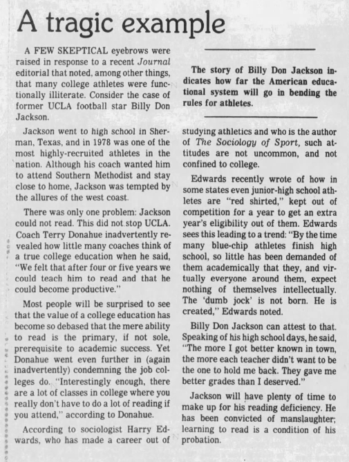 “The one consistent exception to the negative images presented of Blacks in the media has been the black male athlete,” UC Berkeley sociologist Harry Edwards said in a 1982 L.A. Times story that particularly used the Jackson case as the cautionary tale. “The message, though subtle, is clear: If you are Black and want respect, justice and equality of opportunity and reward from white America, become an outstanding athlete.”