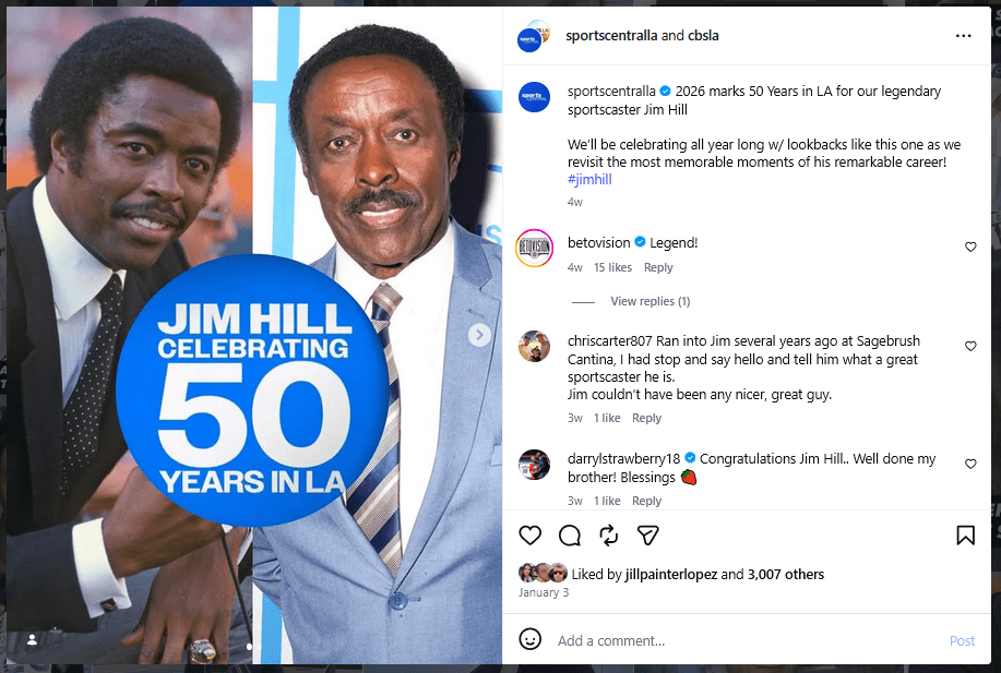 In a 2020 piece for The Athletic about the most iconic sportscasters in Los Angeles — combining anyone who worked behind the mike — Hill was slotted in at No. 5 behind Vin Scully, Chick Hearn, Jamie Jarrin and Jim Healy. It noted: “For 44 years, Hill has been the face of sports television in the Los Angeles market, not only on KCBS and KABC newscasts but at seemingly every game and press conference. Hill long ago achieved the difficult balance of having local sports figures both respect and like him.”