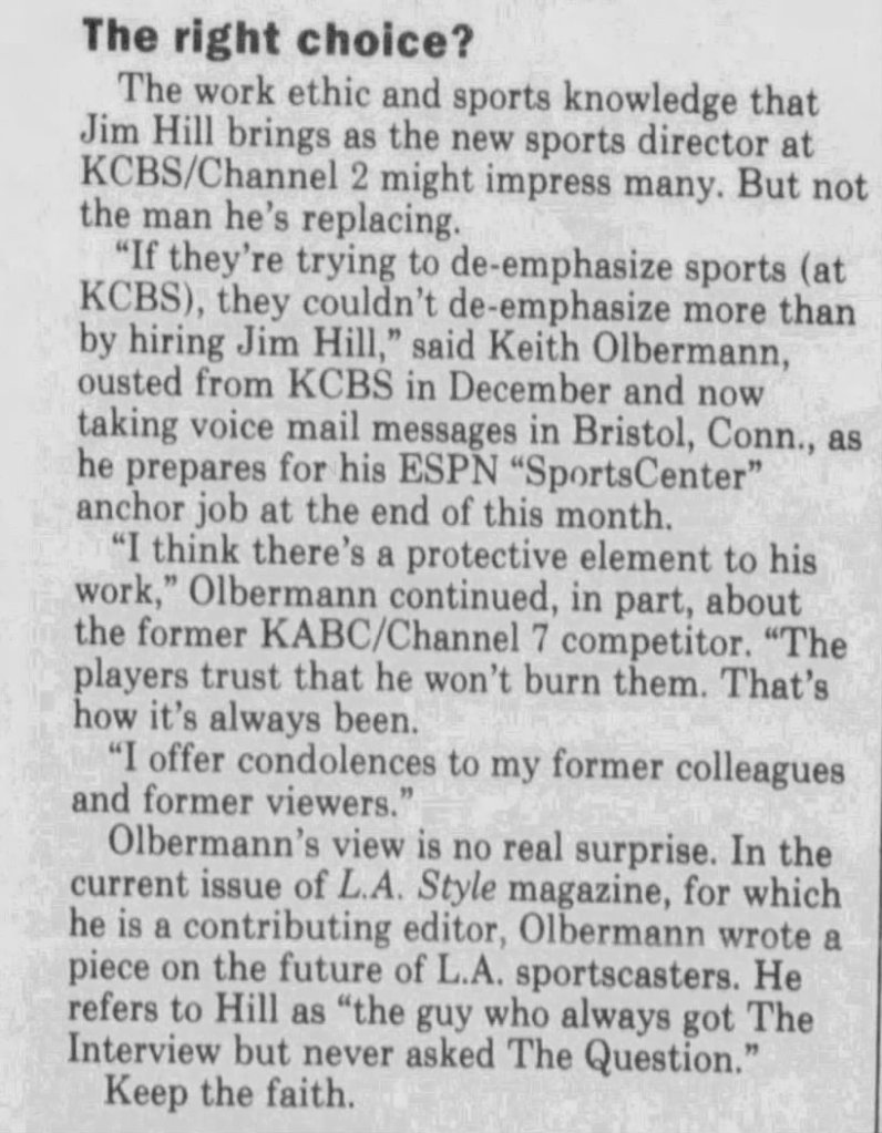 In 2019, when Hill received a lifetime achievement award from the L.A. Press Club, I was asked to offer some opinion of his work for a piece written by Adam Rose. Noting that as far back as 1991, I had been ranking the best of L.A. sports media, I responded: “Through the years, Jim Hill was always the man in town as far as being here, there and everywhere. I spent a lot of hours with him in press boxes talking not just about the business but on how to treat people, things that should be reported and other things that are best kept private.”