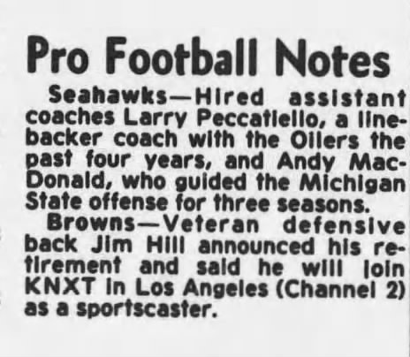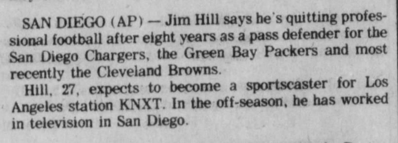 Hill worked an NFL analyst for CBS in 1980, and then did play-by-play roles on regional games. He was CBS’ sideline reporter for its coverage of Super Bowl XVIII in 1984.