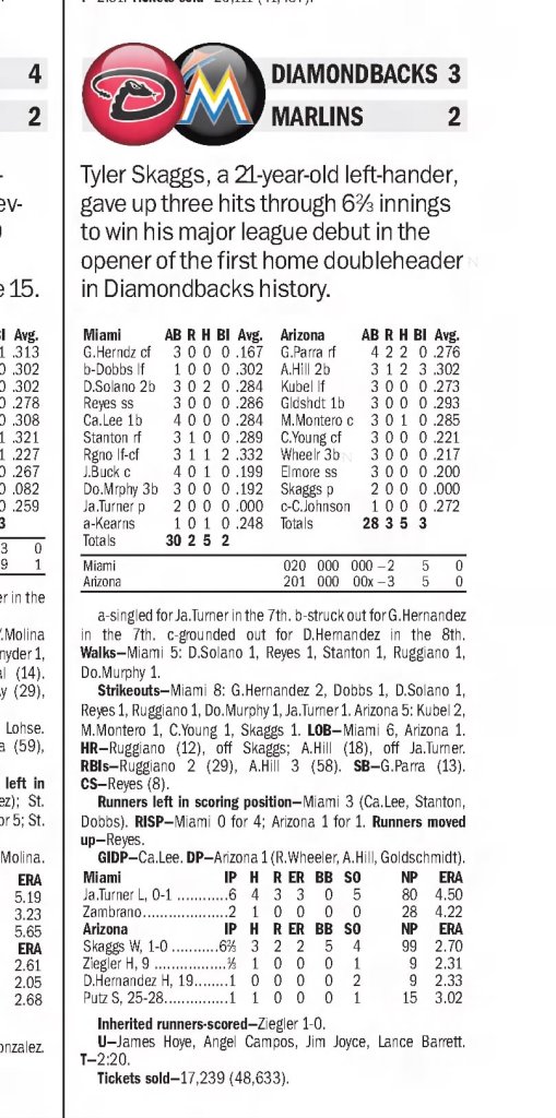 At age 20, Skaggs was promoted to the Diamondbacks’ Double-A Mobile team where he helped it win the Southern League title. In 2011, he was also on the U.S. team for Futures Game at Chase Field in Phoenix during the MLB All-Star break.